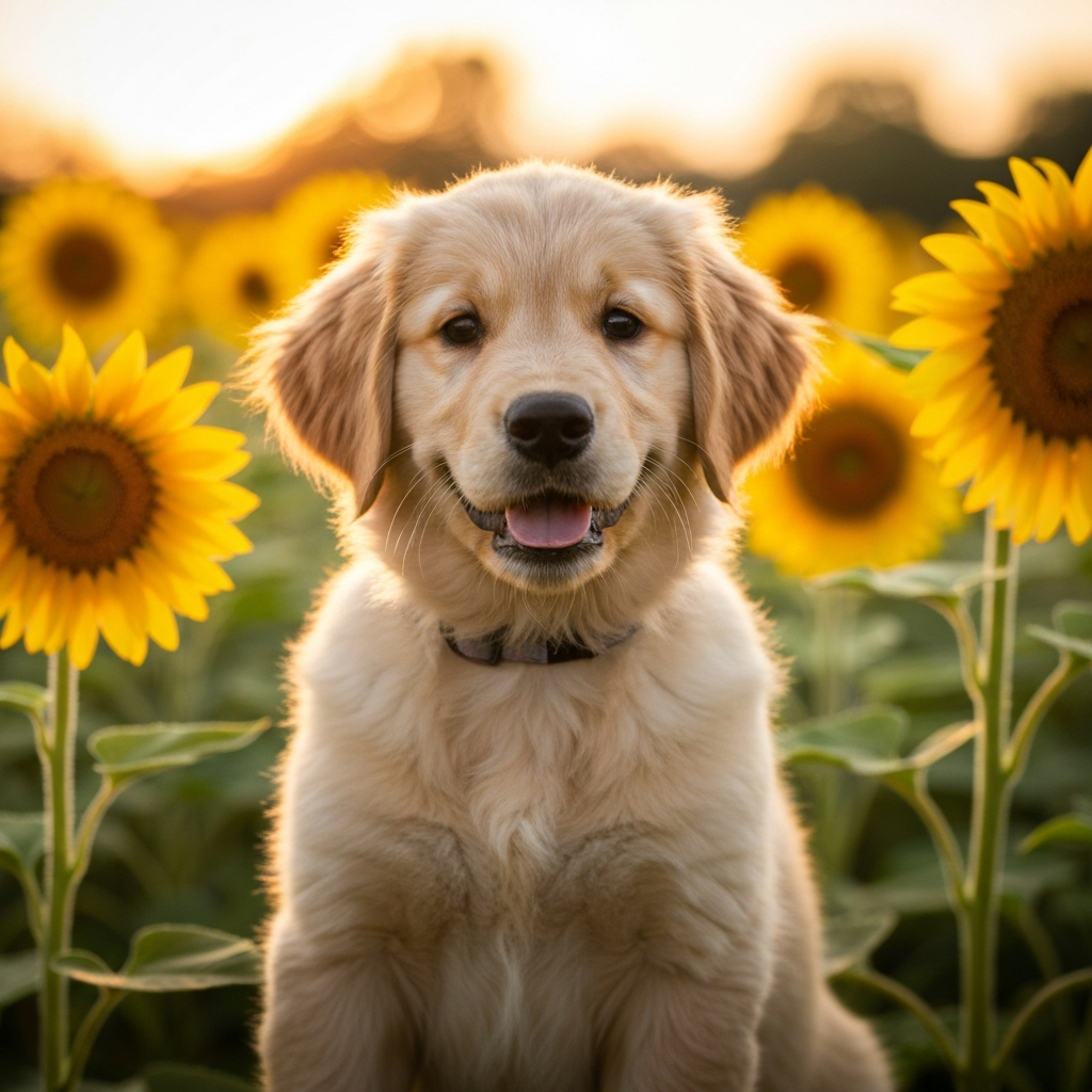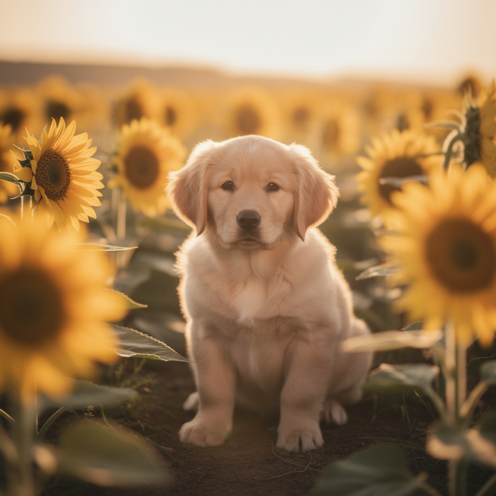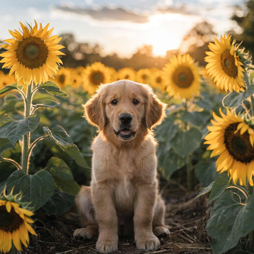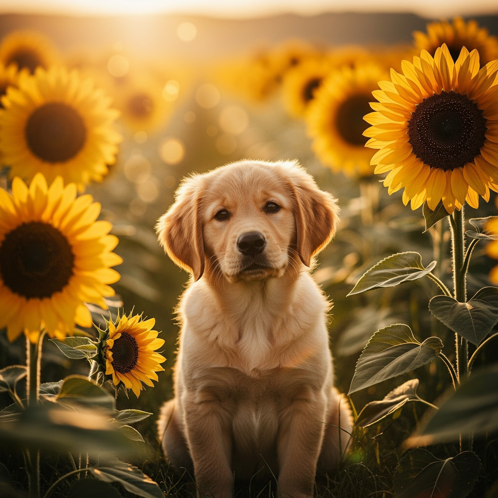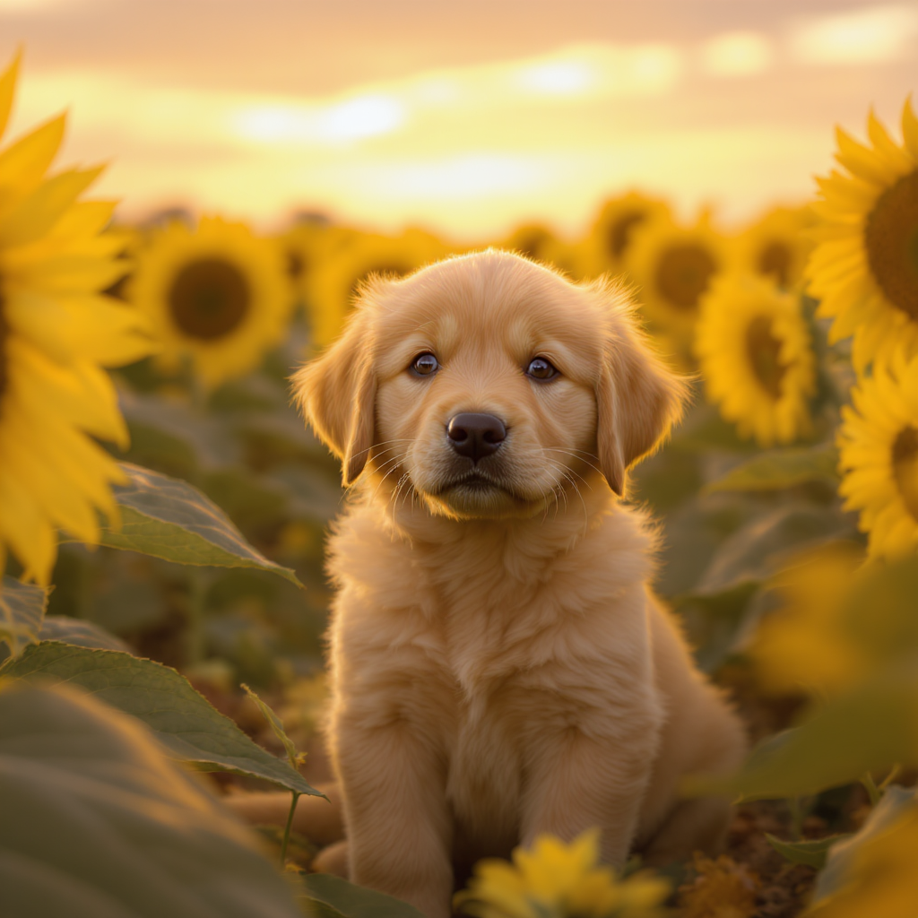 A photorealistic image of a golden retriever puppy sitting in a sunflower field at golden hour, with a soft bokeh background and warm light. Aspect ratio: 1:1, size: 1024x1024.