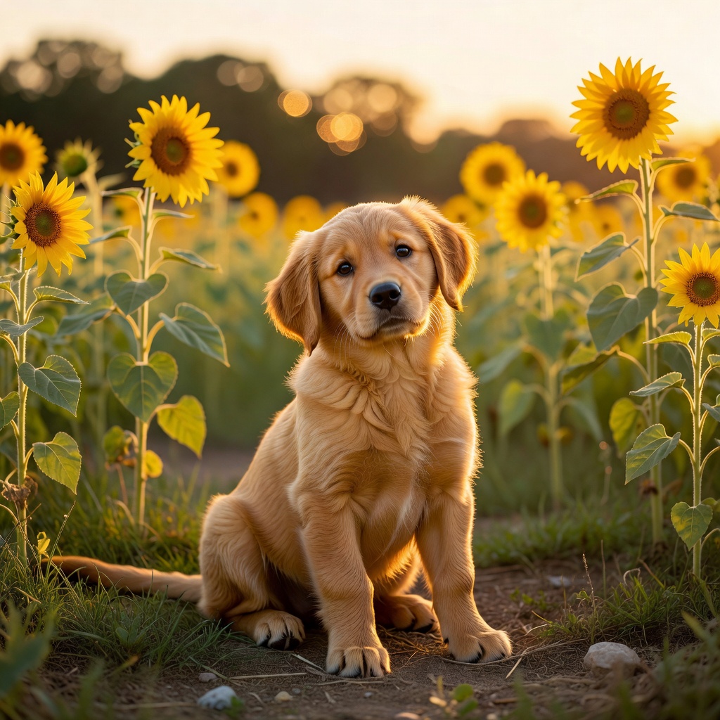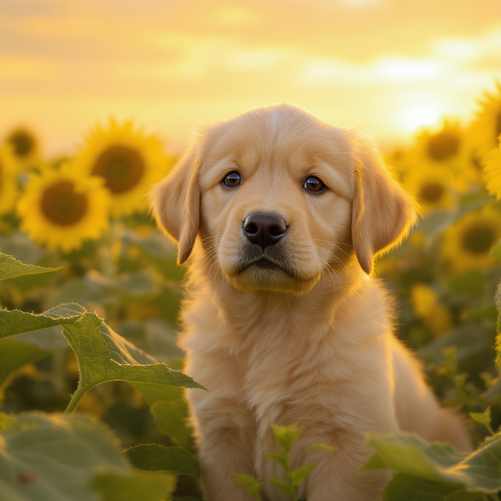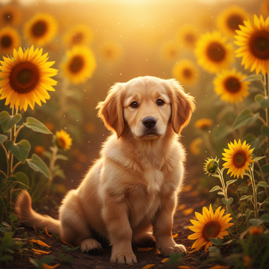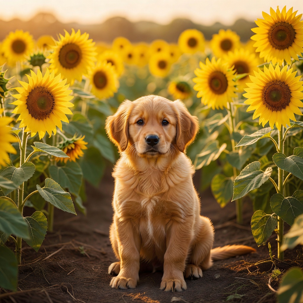 A photorealistic image of a golden retriever puppy sitting in a sunflower field at golden hour, with a soft bokeh background and warm light. Aspect ratio: 1:1, size: 1024x1024.