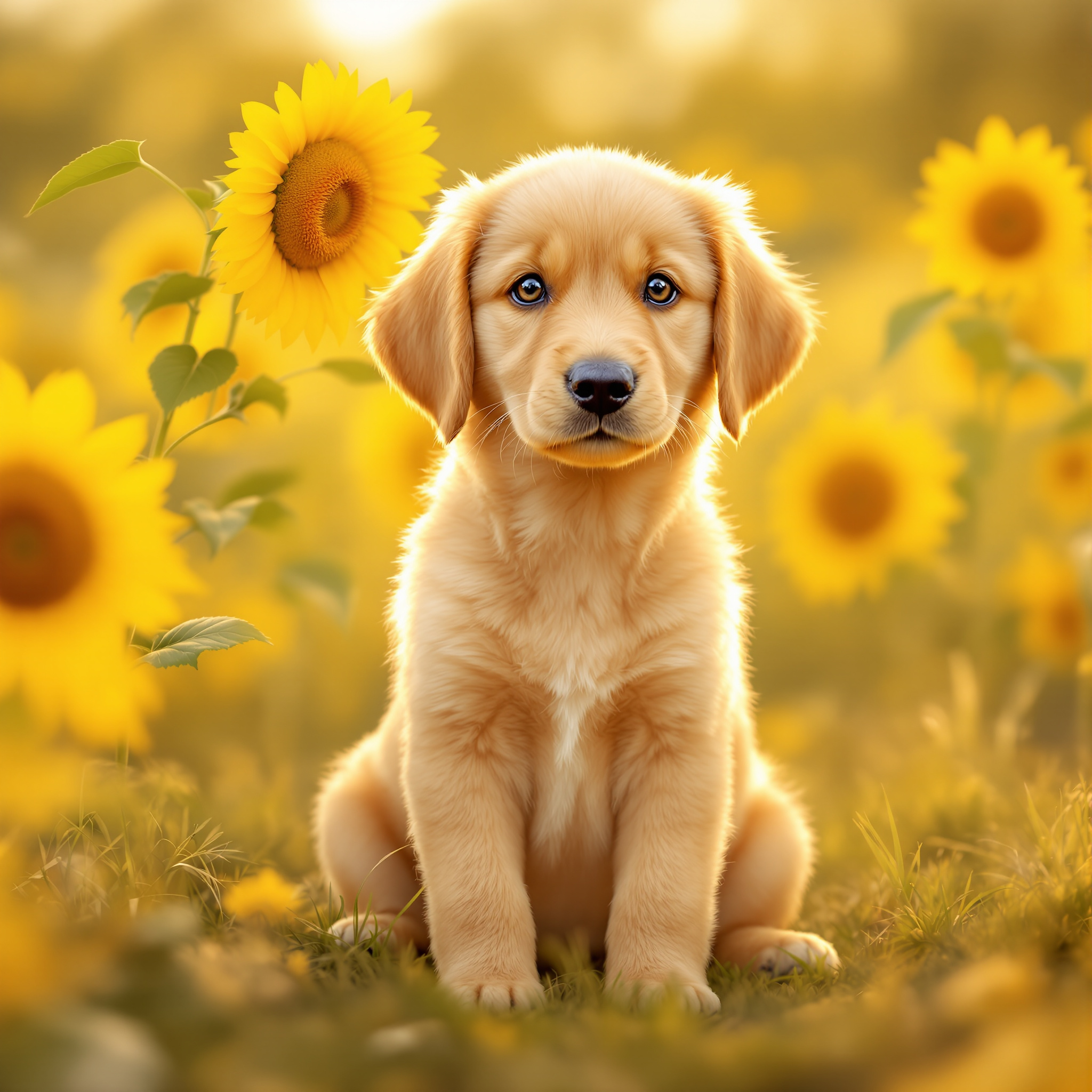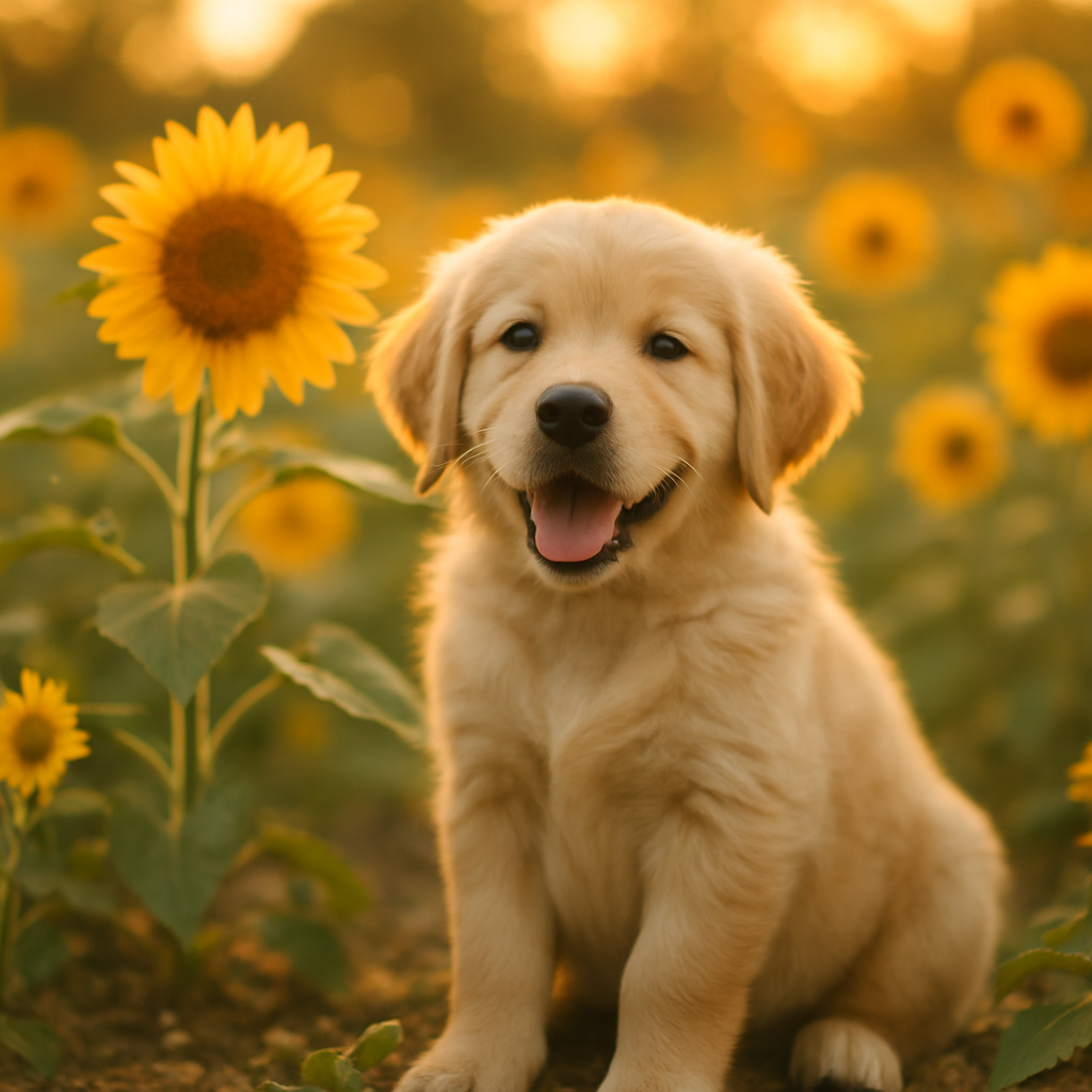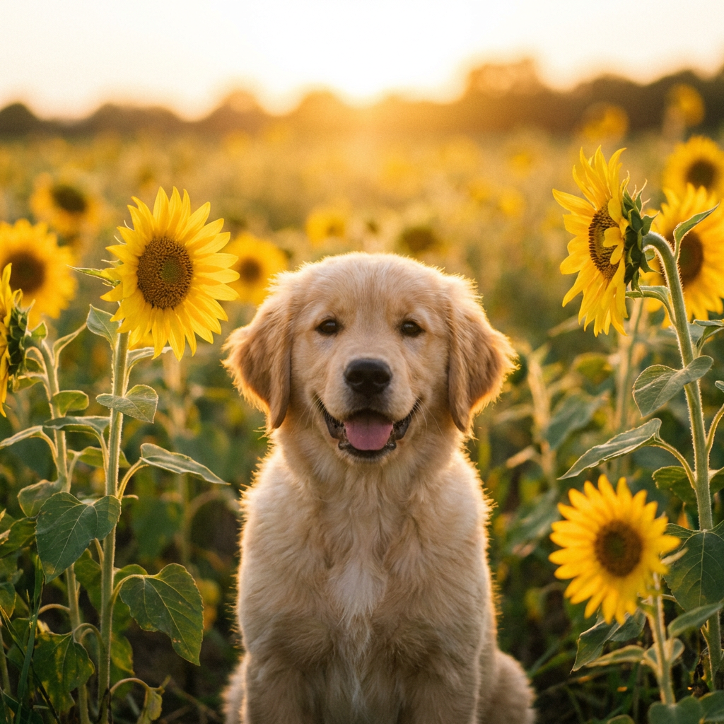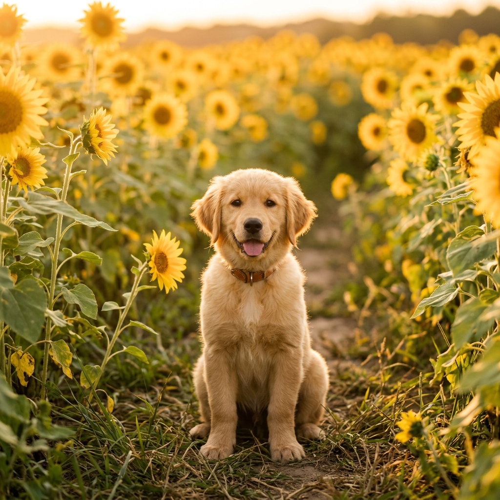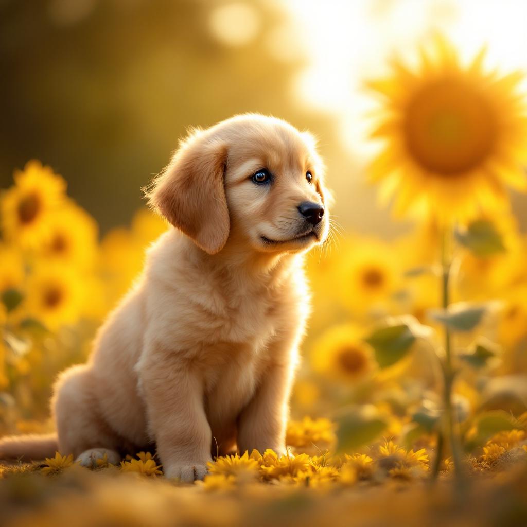 A photorealistic image of a golden retriever puppy sitting in a sunflower field at golden hour, with a soft bokeh background and warm light. Aspect ratio: 1:1, size: 1024x1024.