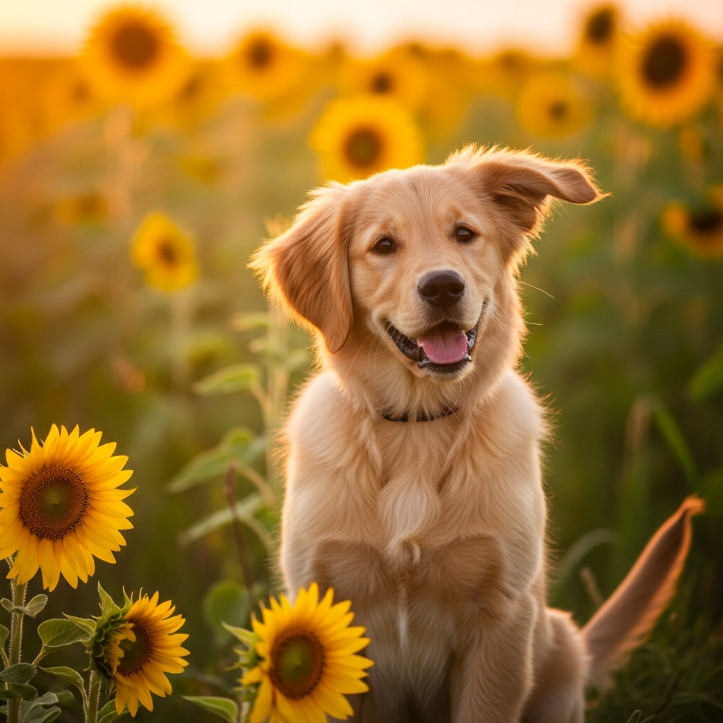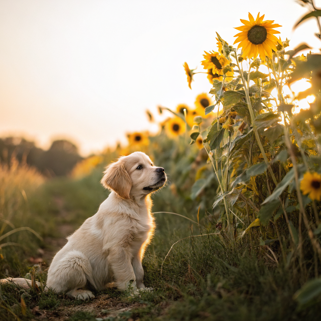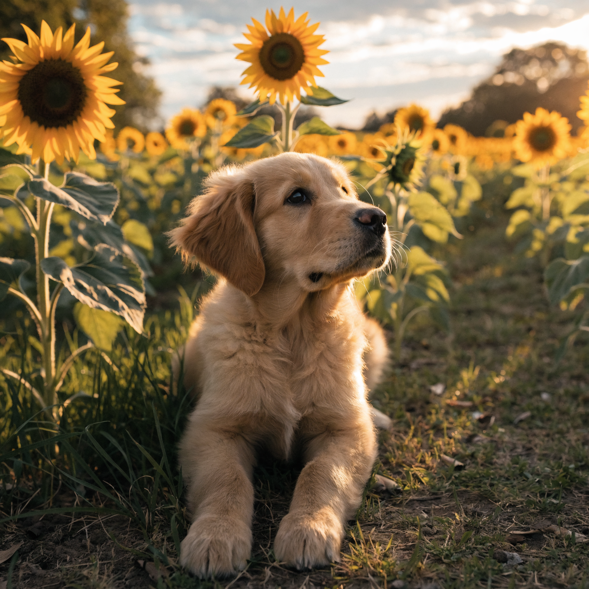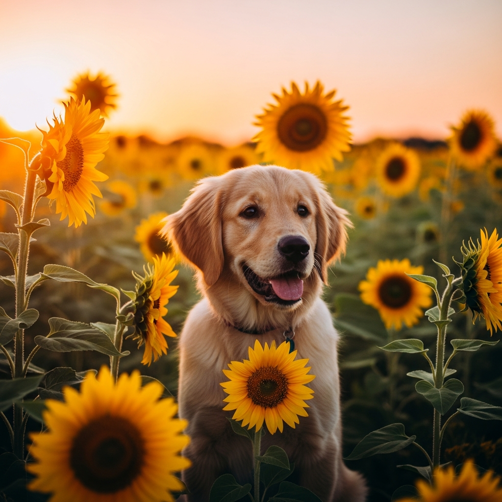 A photorealistic image of a golden retriever puppy sitting in a sunflower field at golden hour, with a soft bokeh background and warm light. Aspect ratio: 1:1, size: 1024x1024.